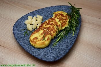 Die Milch zusammen mit 300 – 400 ml Wasser, Salz, Pfeffer und gehackten Rosmarin in einen Topf geben und aufkochen. Polenta-Grieß einrühren und bei milder Hitze ca. 15 Min. köcheln lassen, ab und zu umrühren. Topf vom Herd nehmen und den Parmesan unterheben.