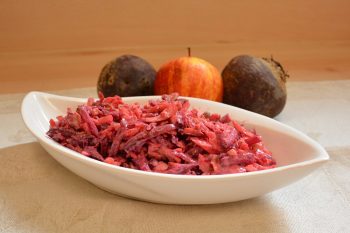 Rote Bete waschen und schälen. Äpfel waschen, vierteln, Strunk entfernen und zusammen mit der Roten Rete grob raspeln. Knoblauch schälen und fein schneiden oder durch eine Presse drücken.