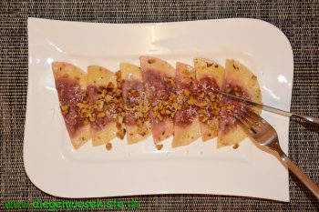 Den Nudelteig entrollen und mit einem runden Ausstecher (ca. 7 – 8cm Durchmesser) aus dem Teig Kreise ausstechen. Die Teigränder mit dem Eiweiß bestreichen. Anschließend die Teigkreise jeweils mit etwas Rote Bete Masse befüllen und dann Ravioli formen. Wichtig dabei ist, dass Sie die Ränder gut zusammendrücken.