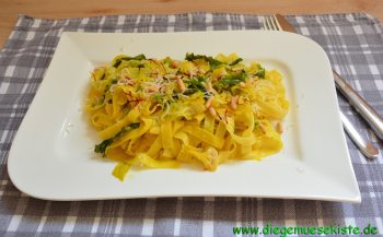 Die Nudeln abgießen, vorsichtig mit dem Wirsing vermengen und nochmals mit den Gewürzen abschmecken. Zum Schluss mit den Pinienkernen und dem Parmesan bestreuen und servieren.
