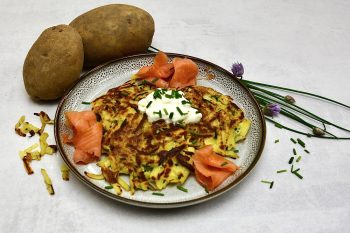 Servieren Sie die Rösti mit einigen Scheiben Räucherlachs.