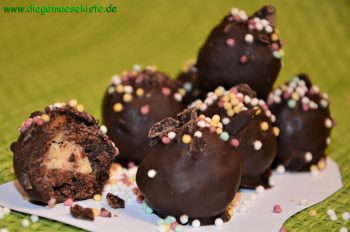 300g Kuvertüre und das Kokosöl grob hacken und unter Rühren im heißen Wasserbad schmelzen. 50g Kuvertüre zum Bestreuen fein hacken. Kuchenbällchen nacheinander auf eine Gabel legen, in die Kuvertüre tauchen, abtropfen lassen und auf Backpapier legen. Mit gehackter Kuvertüre und Non Pareilles bestreuen und trocknen lassen. Gekühlt genießen.