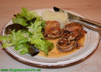 Inzwischen die Schweinelende waschen, trocken tupfen, von evtl. vorhandenen Sehnen befreien und anschließend in 8 – 12 gleich große Scheiben (Medaillons) schneiden. Jedes Stück mit einer Scheibe Dörrfleisch umwickeln, mit Zahnstochern fixieren. Mit Salz und Pfeffer würzen und in etwas Olivenöl langsam von beiden Seiten braten, bis das Fleisch gar ist.
