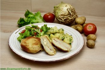 Die Cordon Bleus erst im Mehl wenden, anschließend in den verquirlten Eiern und mit den Semmelbröseln panieren. In heißem Butterschmalz auf beiden Seiten je 2-3 Minuten goldbraun braten.