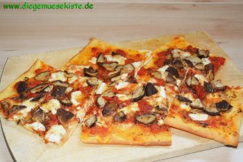 Inzwischen die Tomaten mit Pfeffer, Salz, Oregano und Olivenöl verrühren. Pizzateig ausrollen, mit der Tomatensauce bestreichen. Zuerst Mozzarella, dann die Pilze gleichmäßig darauf verteilen. Im vorgeheizten Backofen bei 220°C ca. 12 – 15 Minuten backen, bis die Pizza goldbraun ist.
