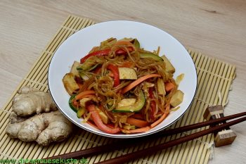 Etwas Olivenöl erhitzen und Tofu und das Gemüse anbraten. Zum Schluss die abgetropften Nudeln dazugeben. Kurz weiterbraten. Ingwer reiben und mit der Tamarisauce verrühren. Das Gemüse und den Tofu damit ablöschen und noch 5 Minuten gar ziehen lassen.