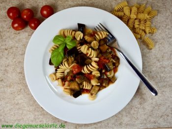 Auberginen in eine lauwarme Pfanne geben, sofort salzen und kurz dünsten, bis das Wasser austritt. Dann Olivenöl, Knoblauch und Zwiebeln zugeben und alles zusammen anbraten. Köcheln lassen, bis die Auberginen gar sind. Wenn das Gemüse zu trocken wird, etwas Nudelwasser zugeben. Kurz vor Schluss die Spiralen, Cocktailtomaten und das Basilikum zugeben. Mit Salz und Pfeffer abschmecken.