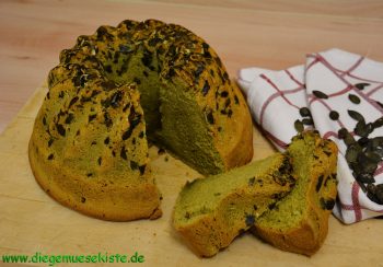 Die Dottermasse mit ca. 1/3 des Eischnees, dem Backpulver und dem Mehl glattrühren, dann den restlichen Schnee unterziehen. Die Gugelhupfform einfetten und mit gehackten Kürbiskernen auslegen. Die Teigmasse einfüllen.