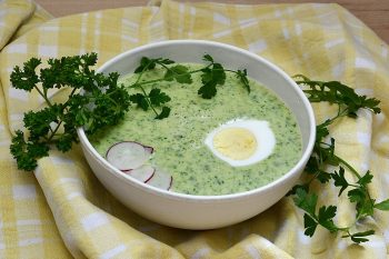 Kräuter fein hacken. Suppe fein pürieren. Gehackte Kräuter hinzugeben und nochmals pürieren. Mit Salz und Pfeffer würzen. Die Suppe in Schalen anrichten. Eier halbieren, salzen und jeweils eine Hälfte in jede Schale geben.