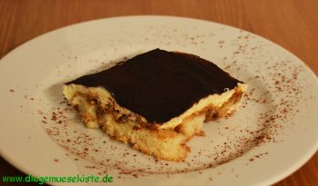 Das Ganze zugedeckt mindestens 5 Stunden, am besten über Nacht in den Kühlschrank stellen. Vor dem Servieren mit dem Kakaopulver bestreuen.