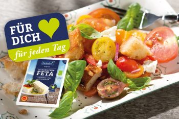 Die perfekte Beilage zum Grillen. Bunte Tomatenvielfalt trifft auf geröstetes Brot und leckeren Feta.