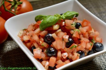 Tomaten, Knoblauch und Basilikum mischen. Nach Geschmack mit Salz, Pfeffer und Zucker würzen. Condimento Bianco und Olivenöl untermischen. Die Heidelbeeren vorsichtig unterheben. Das ganze etwa 1 Stunde ziehen lassen.