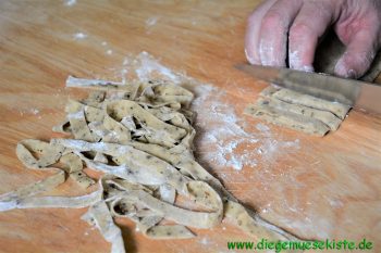 Den Nudelteig in drei gleich große Stücke teilen und diese nacheinander auf der bemehlten Arbeitsfläche sehr dünn ausrollen, der Länge nach lose aufrollen und quer in dünne Streifen schneiden. Die geschnittenen Nudeln locker auseinanderzupfen, dabei etwas im Mehl wenden, damit sie nicht zusammenkleben. Anschließend in einem großen Topf mit reichlich kochendem Salzwasser in 8 – 10 Minuten bissfest garen, abgießen und gut abtropfen lassen.