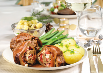 Die Wheaty-Rouladen vorsichtig aufrollen und füllen. Mit einem Zahnstocher oder mit Bra-tenschnur verschließen. Im restlichen Öl rundum anbraten. Zusammen mit der Bratensauce servieren.