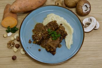 Dazu passt ein Kartoffelpüree, vegane Bratensoße und frischer Salat.