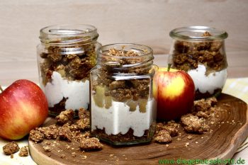 Zum Schluss alles in vier Gläser füllen: Zuerst die Kekskrümel, dann die Vanille-Creme, das Apfel-Kompott und zum Schluss nochmals eine Schicht Kekskrümel.