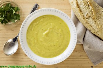 Das Ganze fein pürieren, anschließend Weißwein zugeben und nochmals aufkochen. Nun mit der Hälfte der Sahne verfeinern, nochmals abschmecken und kurz erwärmen, aber nicht mehr zum Kochen bringen. Die restliche Sahne schlagen und beim Servieren auf jeden Teller ein Sahnehäubchen setzen.