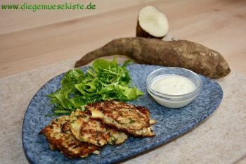 Dazu passt ein grüner Salat. Die Puffer schmecken übrigens auch kalt (Zimmertemperatur) sehr lecker.