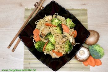 Nun das Gemüse in die Pfanne geben und kurze Zeit braten. Eventuell etwas Nudelwasser zugeben.