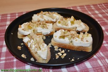 Die Baguette-Scheiben mit Olivenöl bestreichen und im vorgeheizten Backofen 5 Minuten grillen. Aus dem Ofen nehmen, mit Ziegenkäse bestreichen und mit den Walnüssen und Birnen bestreuen. Nochmals für ca. 5 Minuten überbacken.