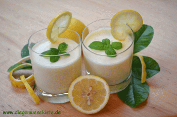 Die Creme nun in 4 Schälchen verteilen und für mehrere Stunden, am besten über Nacht, kaltstellen. Vor dem Anrichten noch mit Zitronenscheiben und/oder Blättchen von Zitronenmelisse bzw. Pfefferminze garnieren.